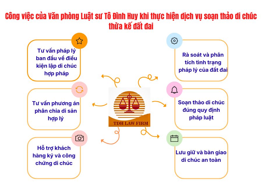 Khi khách hàng lựa chọn dịch vụ soạn thảo di chúc thừa kế đất đai tại Văn phòng Luật sư Tô Đình Huy, khách hàng không chỉ nhận được sự hỗ trợ trong việc lập một bản di chúc đúng pháp luật, mà còn được đồng hành trong toàn bộ quá trình để bảo vệ tối đa ý chí của người lập di chúc,những công việc của chúc tôi sẽ bao gồm: