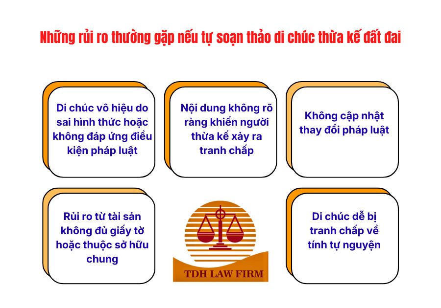 Trong quá trình tự soạn thảo di chúc thừa kế đất đai có thể tiềm ẩn những sai sót dẫn đến di chúc đó không có giá trị pháp lý và vô hiệu hoặc gây ra tranh chấp không đáng có những rủi ro thường gặp có thể bao gồm: